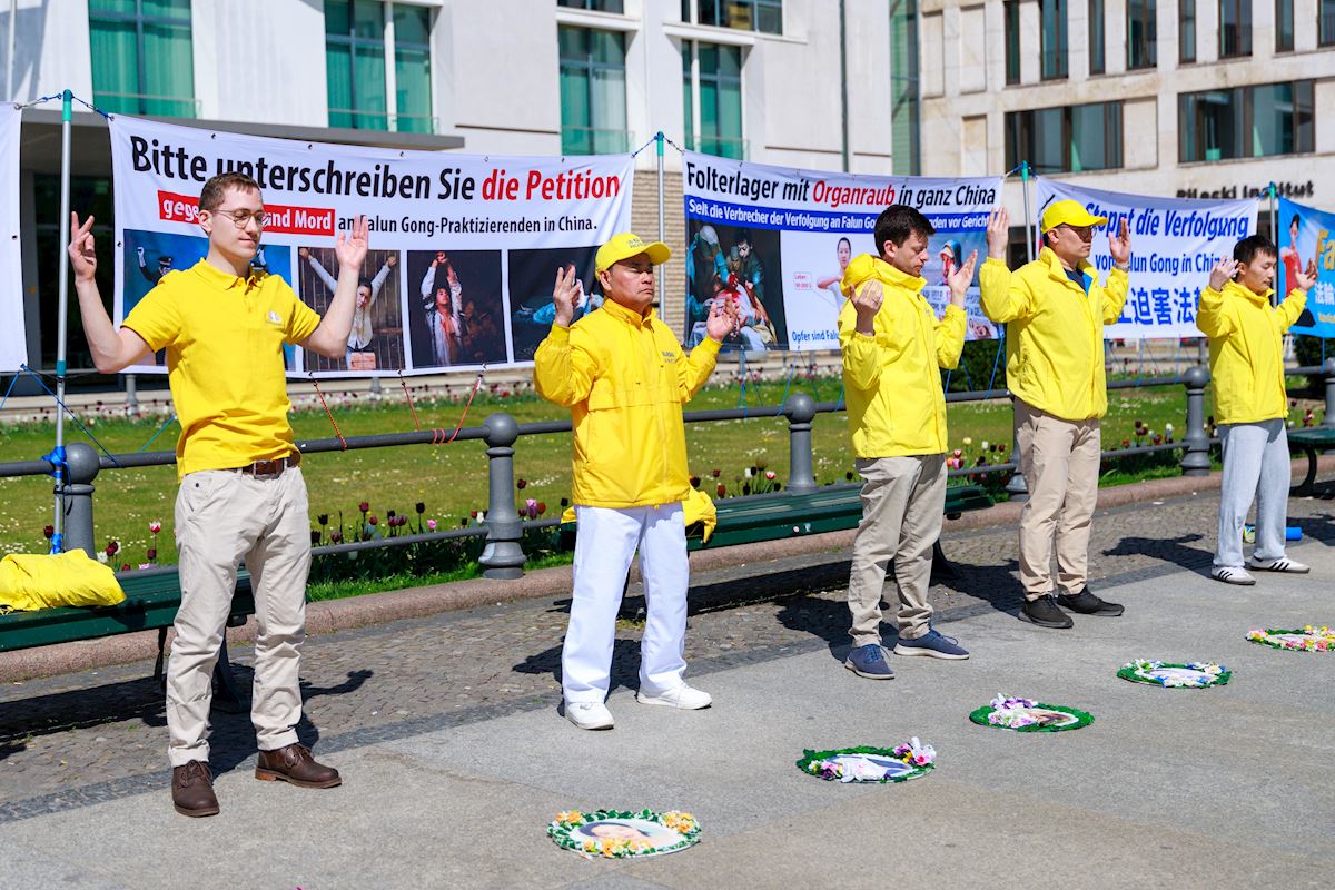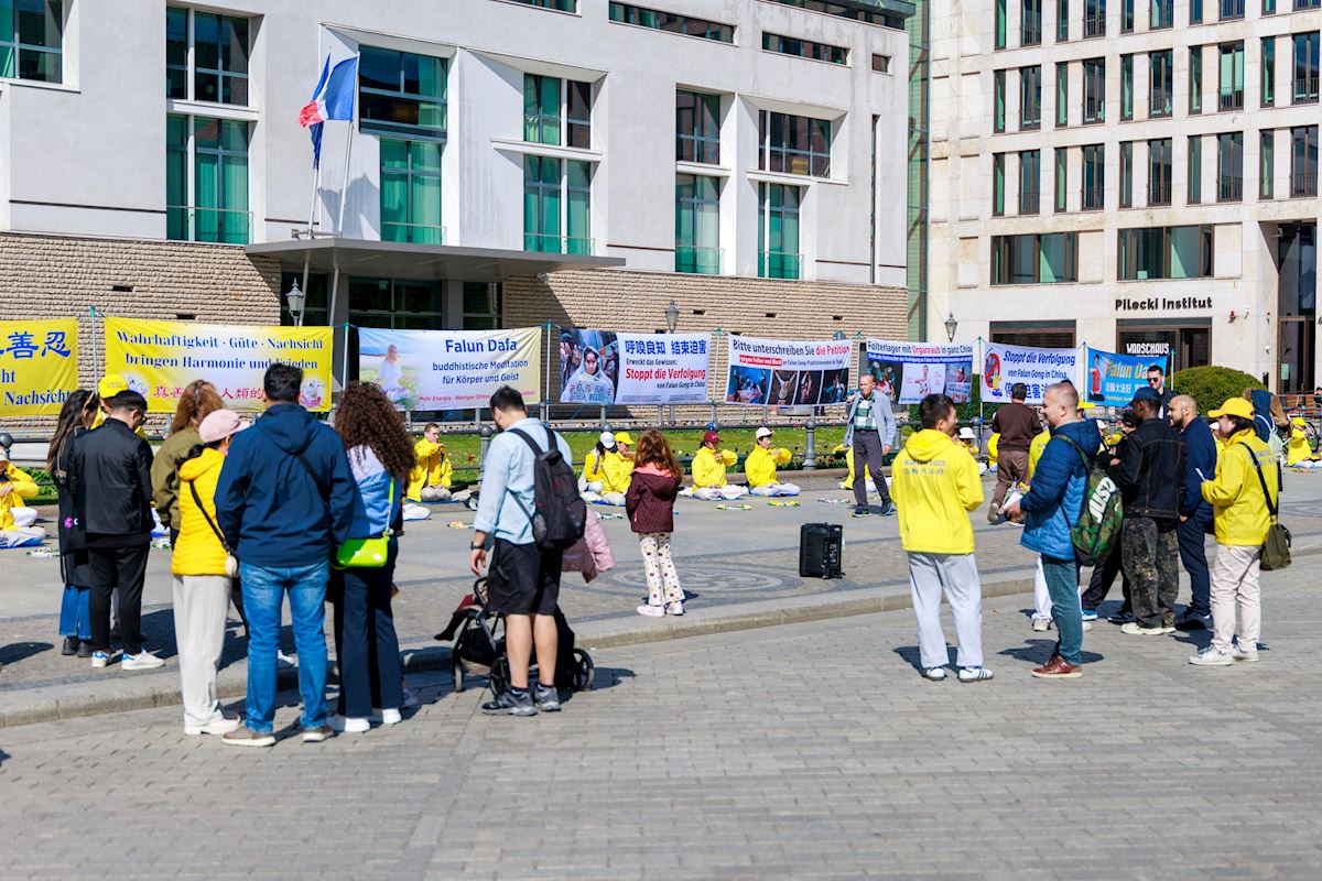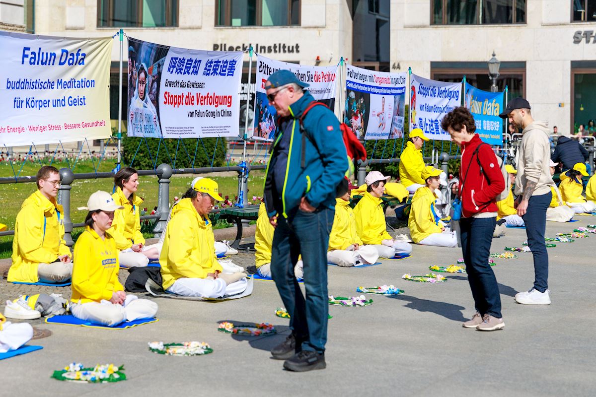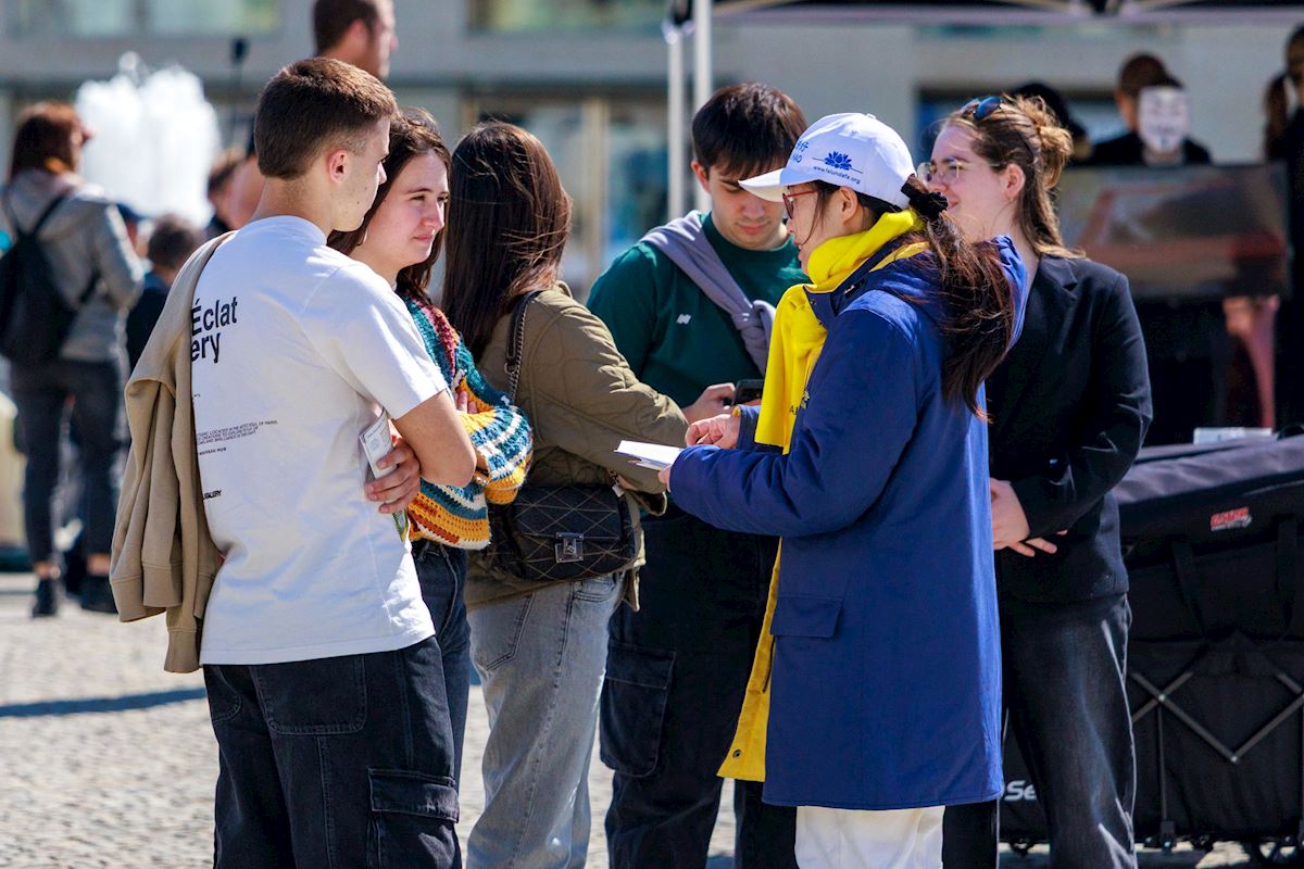 當天的柏林陽光明媚,遊客絡繹不絕。經過勃蘭登堡門的民眾,被舒緩的音樂、祥和的功法展示所吸引,紛紛駐足觀看學員煉功場景,還有的人當場模仿起煉功動作來。在了解法輪功學員紀念和平上訪的真相,還有中共二十七年來對法輪功學員的殘酷迫害以及活摘法輪功學員器官的罪行後,路人紛紛在徵簽表上簽名聲援法輪功學員反迫害,並感謝學員告訴他們這些真相。
