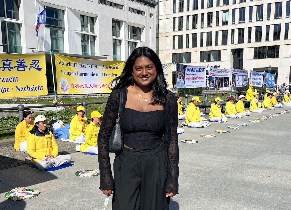 從慕尼黑來柏林旅遊的護士蘇雅娜﹒桑德拉(Sujana Sundran)和朋友緹雅(Tia),在勃蘭登堡門前看到學員的煉功場面,馬上被吸引住了。她們在信息台前與法輪功學員交談了許久。桑德拉說:「這(中共活摘法輪功學員器官)太殘酷了。人是人,我們都生活在一個世界上,不應該發生這種事情。」了解真相後,她和朋友Tia都在反迫害的徵簽薄上簽下了名字。