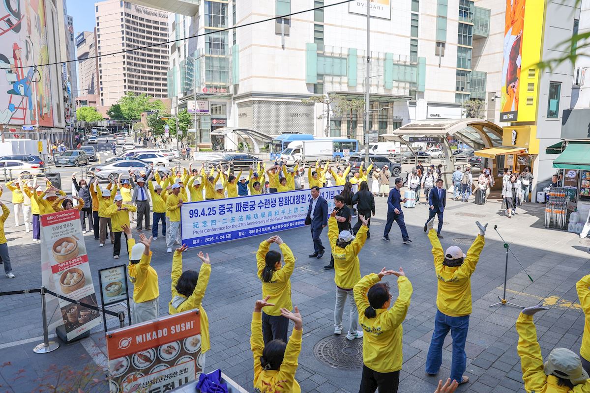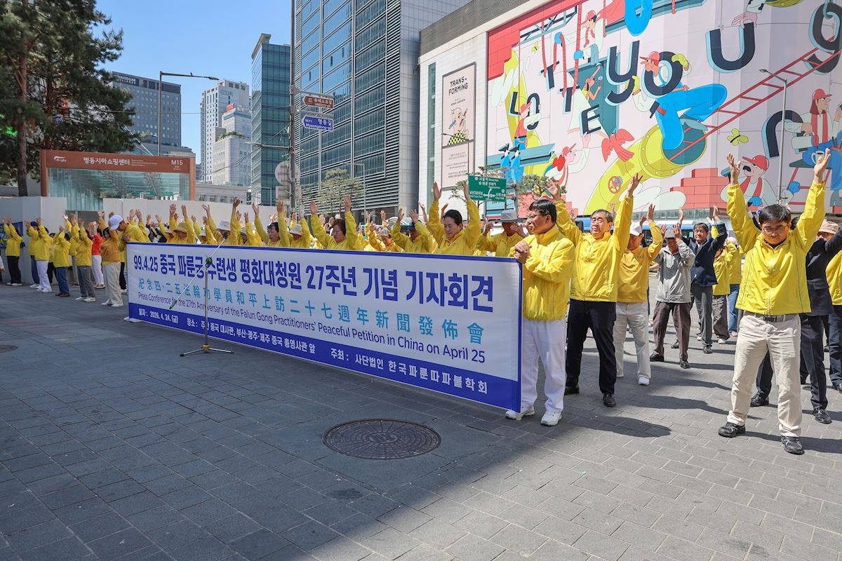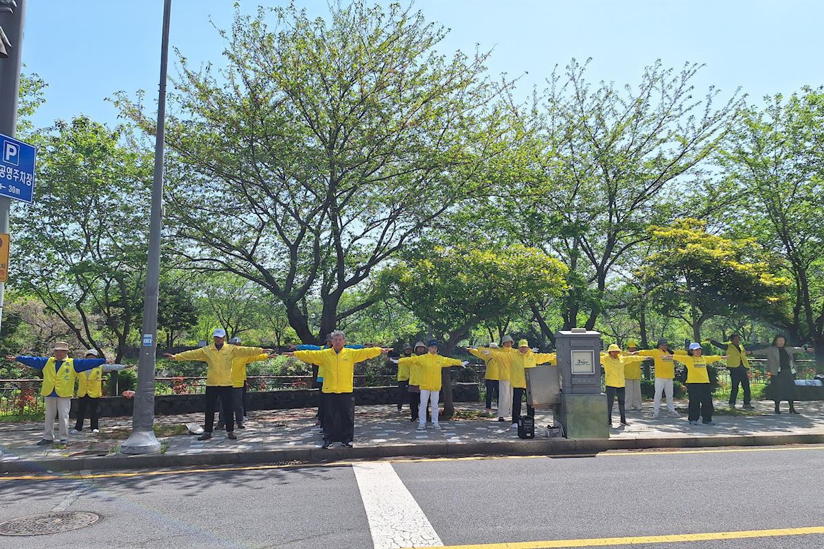 當天在首爾的活動中,來自首都圈的法輪功學員身著黃色上衣,於上午十點整齊有序地集結,並在記者會前集體煉功。伴隨著舒緩的煉功音樂,學員們整齊的動作吸引了眾多市民與遊客駐足觀看,祥和寧靜的現場氛圍令旁觀者印象深刻。