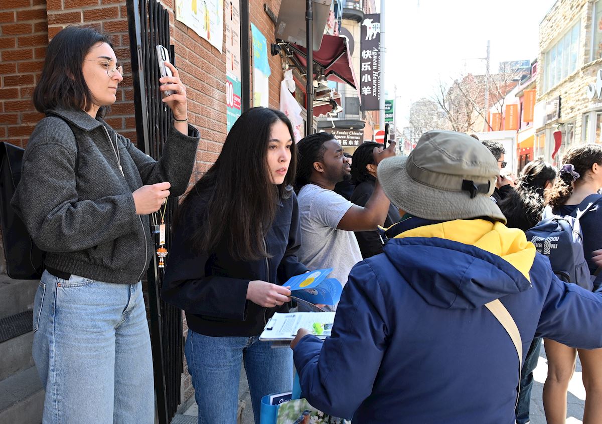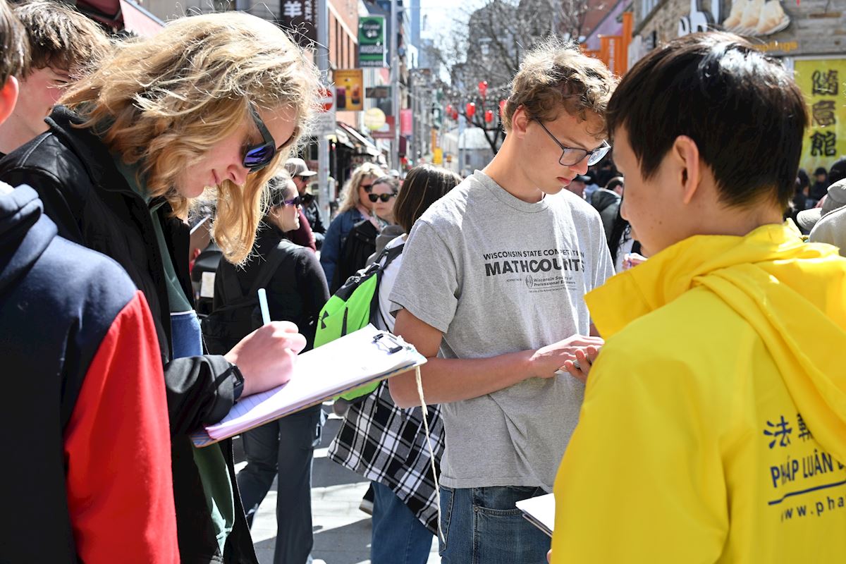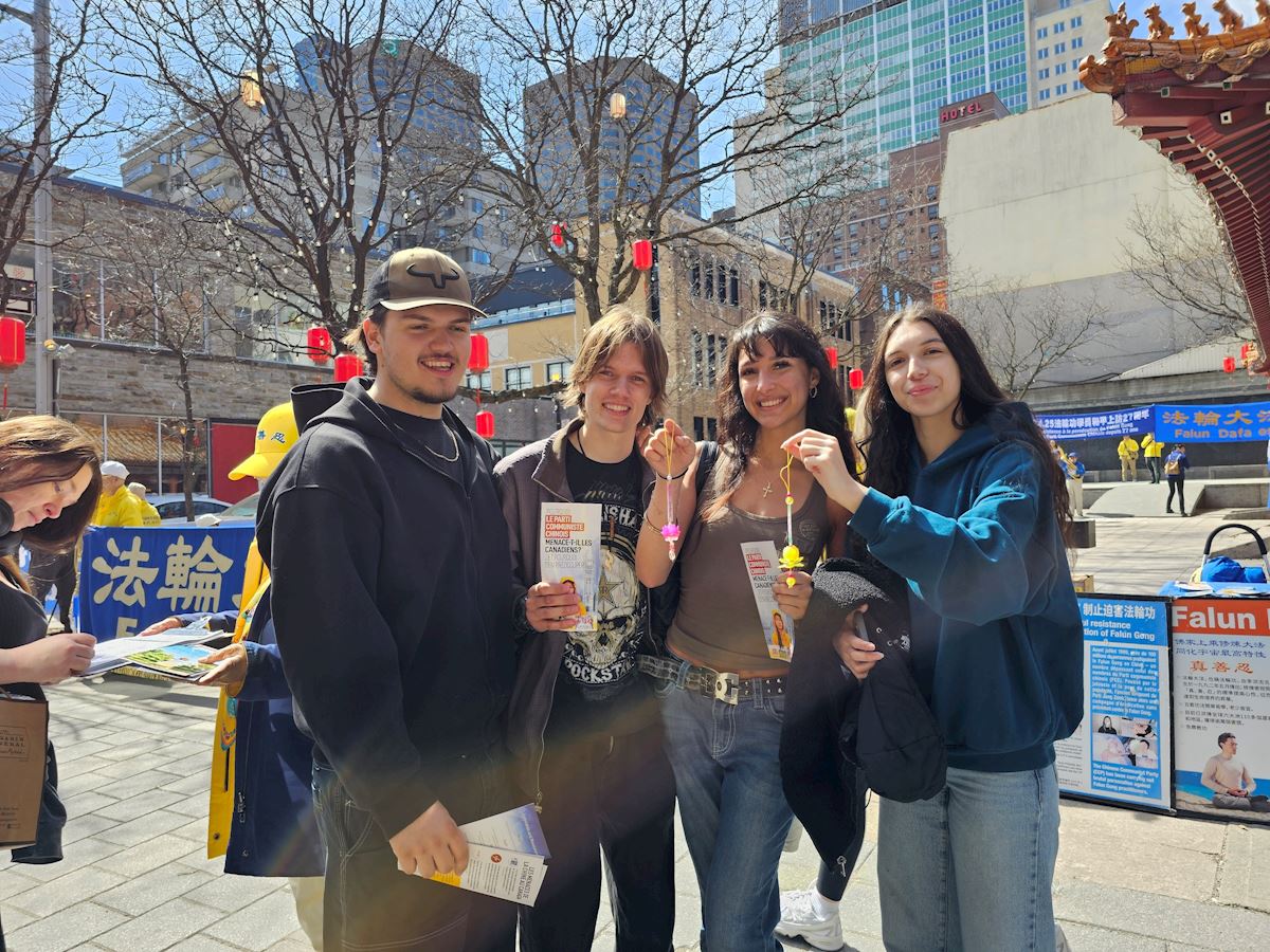 這三位學生表示,這是第一次看到法輪功學員的現場活動,想了解更多的信息。每個人都拿了《九評共產黨》和其他的真相資料。他們還談到特別想看神韻。其中一名男生不久前觀看了多倫多的第一場演出,說特別美好。另一個男孩說:「我知道這是一生中一定要的演出。」