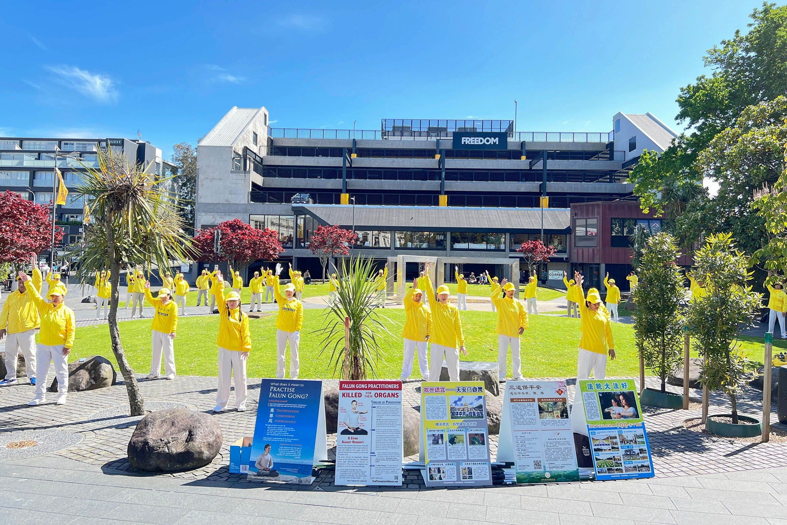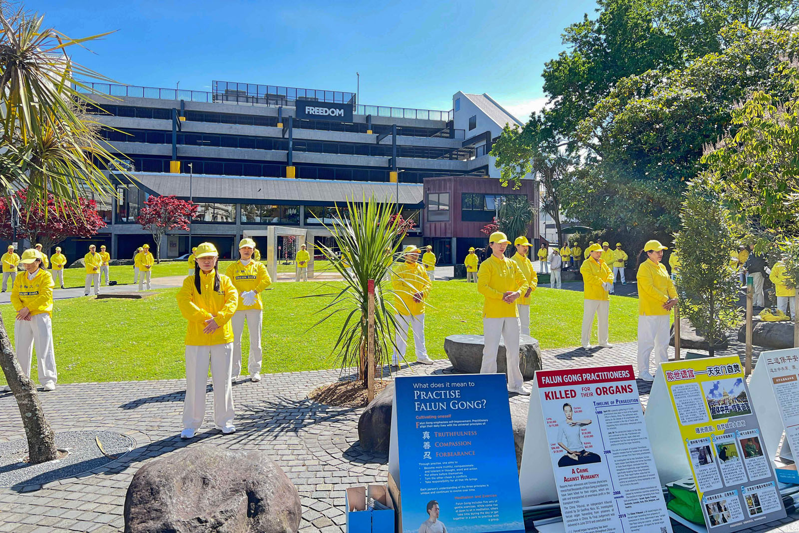 | 【明慧網二零二五年十一月二日】(明慧新西蘭記者站報導)二零二五年十一月一日,法輪功學員在新西蘭奧克蘭新市場(Newmarket)商業中心的拉姆斯登・格林(Lumsden Green)公園舉行煉功與講真相活動,向公眾揭露中共持續二十六年來對法輪功的迫害事實,並呼籲社會各界關注中共迫害人權與信仰自由。 活動現場氣氛祥和,煉功音樂悠揚。學員們整齊地展示法輪功功法,寧靜平和的場面吸引了許多路人駐足觀看。人們紛紛走近展位,閱讀真相資料,聆聽學員講述法輪功在中國遭受的迫害。 隨著越來越多的新西蘭民眾了解真相,人們紛紛表達對法輪功學員的敬意與支持。許多人表示,希望中共立即停止迫害,還給中國民眾信仰自由與基本人權。  圖1~3:二零二五年十一月一日,新西蘭奧克蘭法輪功學員在新市場的拉姆斯登・格林公園煉功。 |