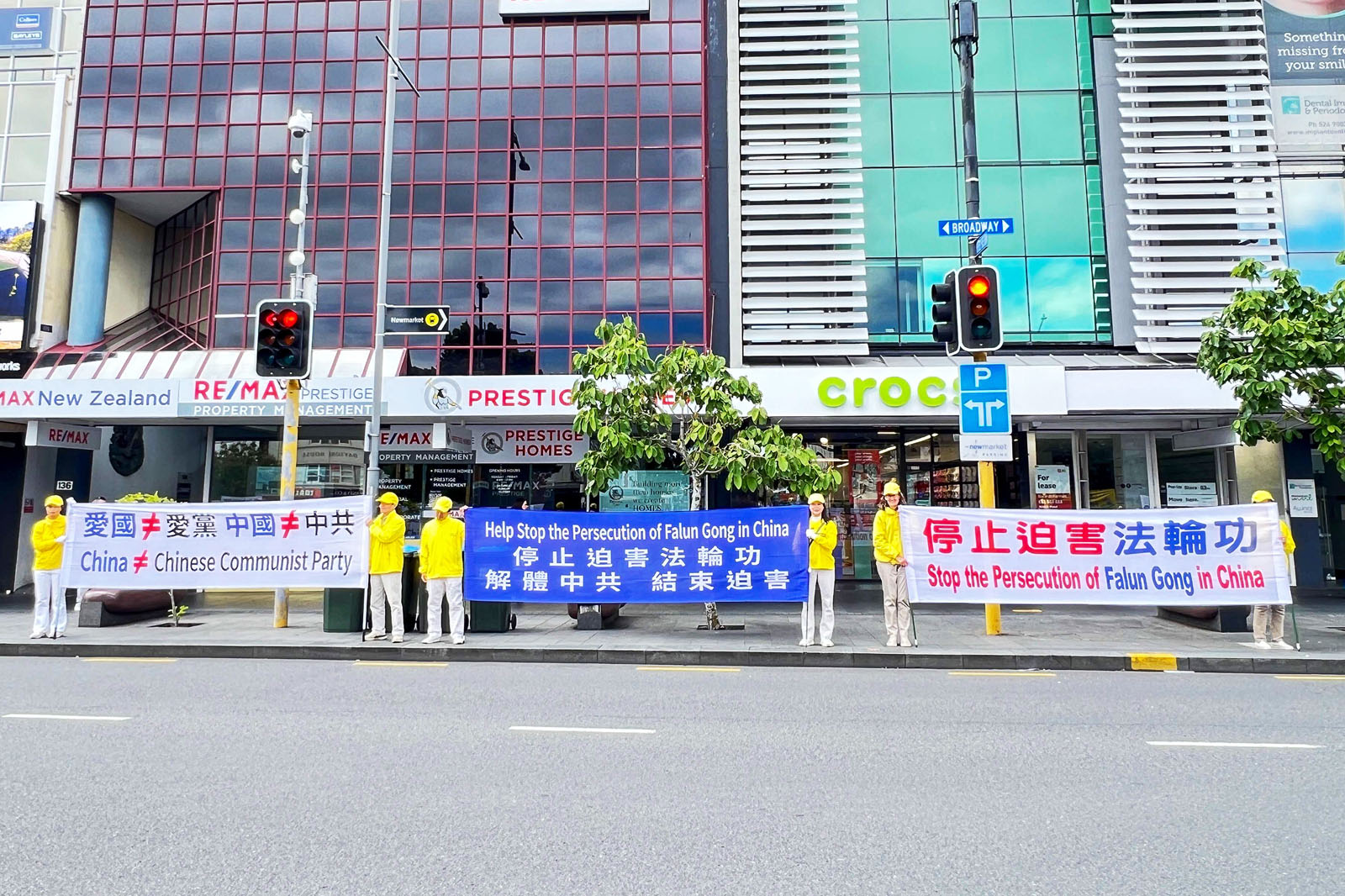 圖4~5:法輪功學員在奧克蘭新市場商業中心展示真相橫幅。 |