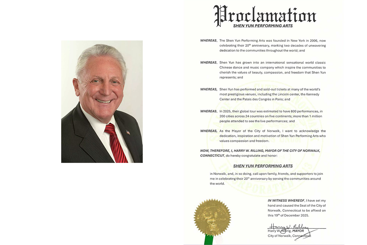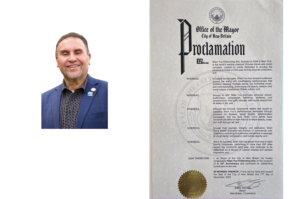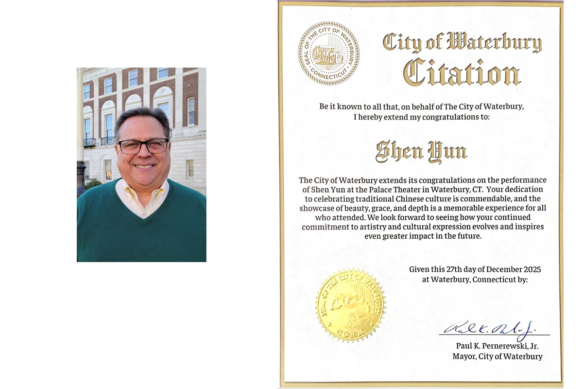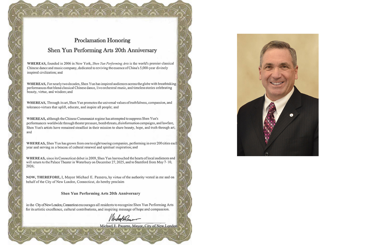 紐倫敦市:神韻弘揚真、善、忍普世價值 此外,紐倫敦市市長邁克爾﹒E﹒帕塞羅也在褒獎令中「敬賀神韻藝術團創立20週年」。帕塞羅說: 「神韻藝術團於二零零六年在紐約成立,是世界上首屈一指的中國古典舞蹈和音樂團體,致力復興中國五千年神傳文明的精髓; 「近二十年來,神韻令人驚嘆的精彩演出融合中國古典舞、現場交響樂,以及稱頌美、德行與智慧的永恆故事,激勵了全球觀眾; 「神韻透過藝術弘揚真、善、忍普世價值,這些美德能夠提升、教育並激勵所有的人; 「儘管中共政權企圖以施壓劇院、炸彈威脅、造謠抹黑和法律戰等手段來壓制神韻在世界各地的演出,但神韻藝術家們始終堅定不移地履行使命,通過藝術來分享美、希望與真理; 「神韻已從一個巡迴演出團發展到八個團,每年在二百多個城市演出,成為文化重生、精神啟發的燈塔; 「神韻自二零零九年在康涅狄格州首演以來,就打動了當地觀眾的心;她將於二零二五年十二月二十七日回歸沃特伯裏派雷斯劇院,並於二零二六年五月七日至十日再臨斯坦福市; 「鑑於此,本人──市長邁克爾﹒E﹒帕塞羅,憑借賦予我的權力,並代表康涅狄格州紐倫敦市,謹嘉獎神韻藝術團創立20週年。 「康州紐倫敦市鼓勵所有居民讚賞神韻藝術團的卓越藝術成就、文化貢獻,以及鼓舞人心的希望與慈悲主題訊息。」 正統文化回歸 人心向善 從一個巡迴演出團發展至如今擁有八個同等規模藝術團體,神韻每年在全球兩百多個城市演出,被各界譽為復興中華神傳文化、淨化人心、啟迪良知的重要力量。 隨著2026演季在康涅狄格州拉開序幕,神韻將繼續以純正藝術照亮世界,為更多有緣人帶來希望、覺醒與光明。 |