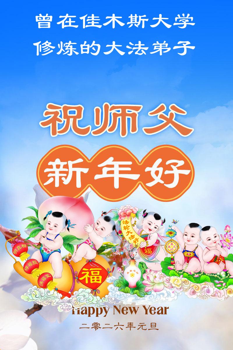 我和丈夫及兩個上小學的孩子都修大法。無論是疫情期間還是目前的甲流,兩個孩子都沒染疫,她們都說感謝師父的保護。我母親修大法,重病痊癒,身體健康,幹活像年輕人。我弟弟不修煉,支持大法,有了理想的工作,他說自己是明真相得福報了,要感謝大法、感謝大法師父。我們全家六人祝師父新年愉快!新年好! 山東招遠一家六人敬上 大陸高校大法弟子恭祝師尊新年好!