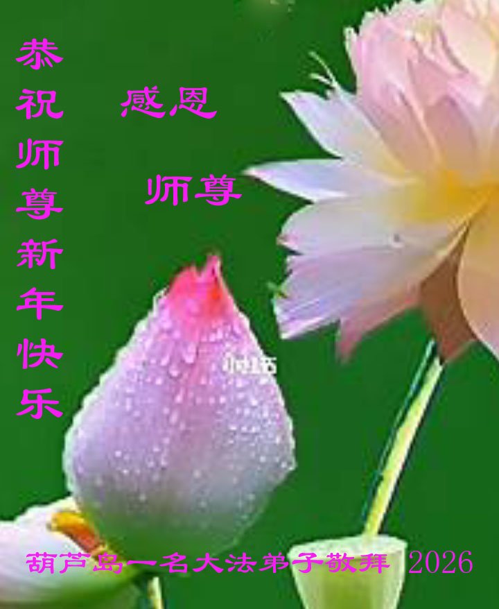 葫蘆島一名大法弟子恭祝師尊新年快樂! 師尊您好!弟子想念您!謝謝師尊的慈悲救度! 在這正法的修煉最後時刻,我要更好的學好法,向內找,修好自己,兌現誓約,向世人講清真相,多救人。圓滿功成與師同回天國。 葫蘆島一名大法弟子敬上 二零二六年元月一日 遼寧省葫蘆島一大法弟子及全家人恭祝師尊新年快樂!