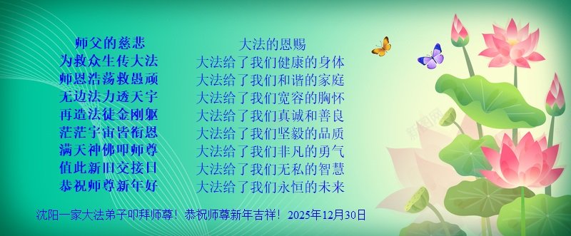 瀋陽市一家大法弟子恭祝師尊新年好! 師父的慈悲 為救眾生傳大法 師恩浩蕩救愚頑 無邊法力透天宇 再造法徒金剛軀 茫茫宇宙皆銜恩 滿天神佛叩師尊 值此新舊交接日 恭祝師尊新年好! 大法的恩賜 大法給了我們健康的身體 大法給了我們和諧的家庭 大法給了我們寬容的胸懷 大法給了我們真誠和善良 大法給了我們堅毅的品質 大法給了我們非凡的勇氣 大法給了我們無私的智慧 大法給了我們永恆的未來 瀋陽一家大法弟子叩拜師尊!恭祝師尊新年快樂! 2025年12月30日 遼寧省葫蘆島大法弟子一學法小組大法弟子恭祝師尊新年快樂!