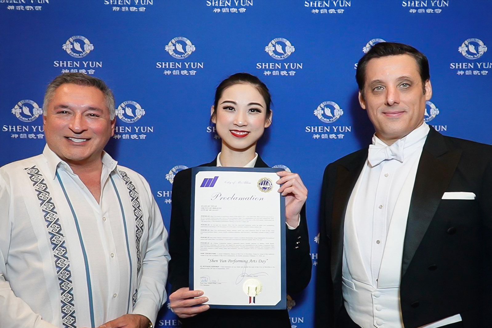 圖11:二月二十一日晚,德州麥克艾倫市長哈維爾﹒維拉洛博斯(Javier Villalobos,左)為神韻藝術團演員頒發褒獎,並宣布二零二六年二月二十一日為 「神韻藝術日」 。(新唐人電視台) |