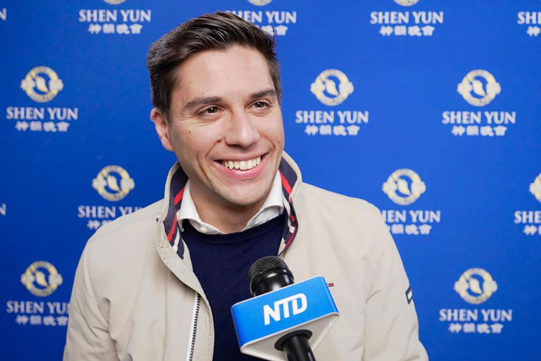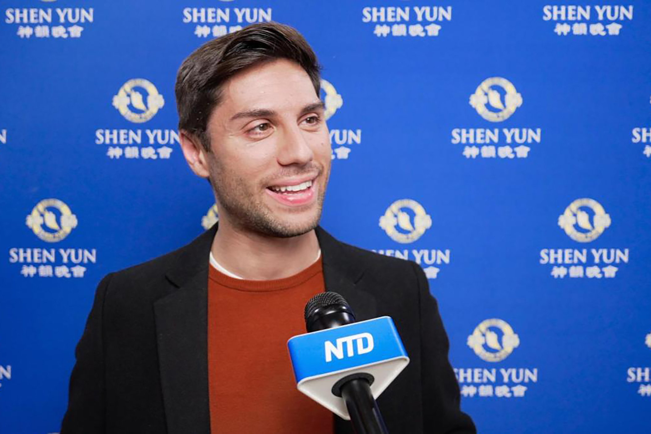 德州麥克艾倫市長哈維爾﹒維拉洛博斯觀看演出後表示,能夠親臨現場看演出深感榮幸, 「這是一場極為精彩、令人震撼的演出」。 他讚揚神韻致力於復興傳統文化,並喚起社會對迫害的關注,「這樣的演出讓人們在欣賞藝術的同時,學習並思考。如果不走進劇院,很多人不會真正了解這些故事。」 他特別提到節目中法輪功修煉者遭受迫害、雙眼失明,最終重見光明的故事令他深受觸動。他說:「我能感受到那種痛苦與壓迫,而最後那種奇蹟般的轉變令人震撼。」 他表示,「在這個時代仍存在迫害,這是無法接受的。」 意大利雙胞胎藝術家:神韻對全世界都很重要  圖12:二零二六年二月十七日晚,意大利藝術家丹尼爾﹒維塔(Daniele Vita)在意大利羅馬觀看了神韻演出。(新唐人電視台) |